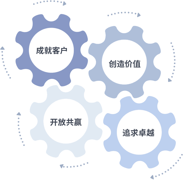 成就客户是一切决策的出发点,,,,创造价值是衡量所有工作的标准,,,追求卓越是来利国际w66做事做人的态度,,,,开放共赢是来利国际w66的格局也是最终的结果。。。。价值观的齿轮环环相扣,,推动着组织里的每个人不断向前。。